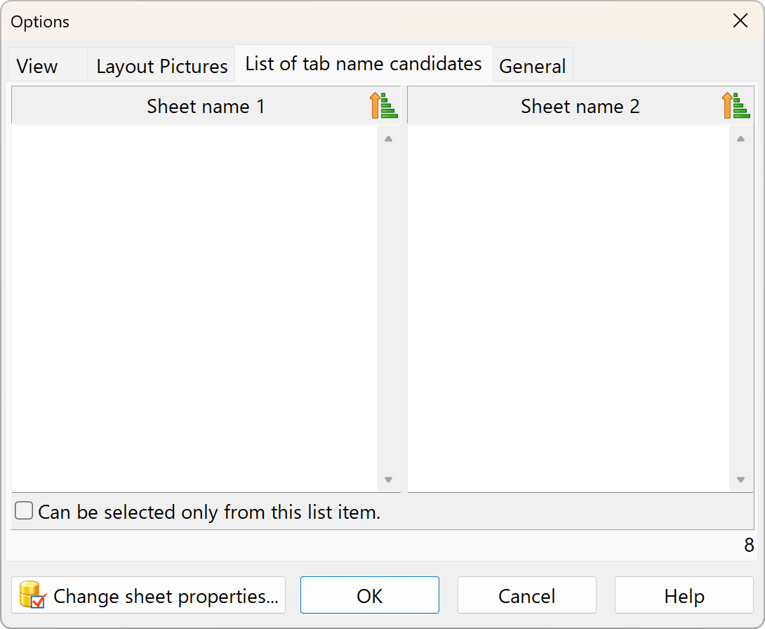 Register frequently used items as sheet names. The values you set individually will appear as suggested sheet names in the drop-down menu under “Sheet Properties.” You can register two types of items, such as material type and thickness, and use them in combination.